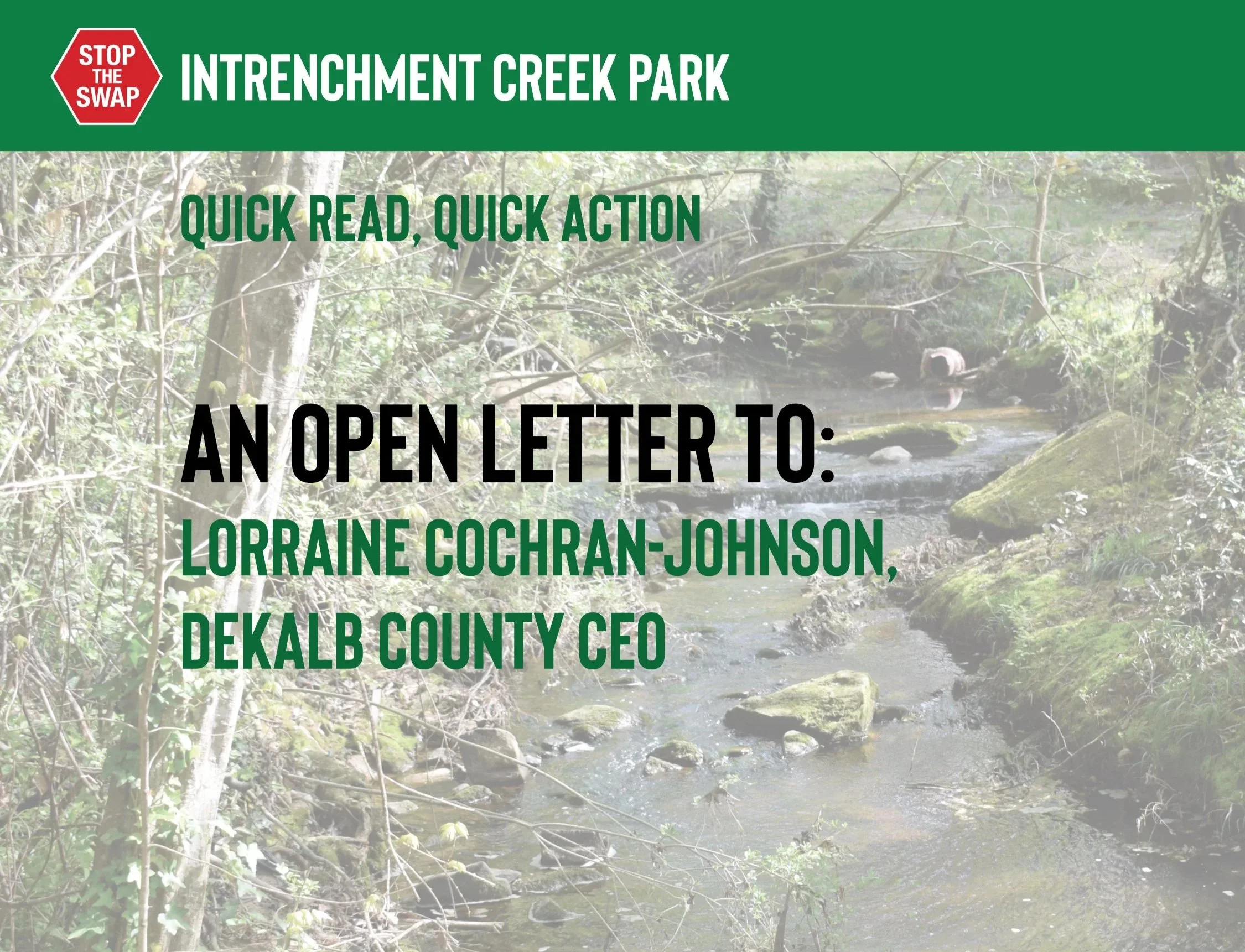 Please use the power of your office to enter the County into the Quiet Title mediation process, return Intrenchment Creek Park, in its entirety, back to the citizens of DeKalb, lift the executive order, and reopen our beloved park. You have the ability and authority!